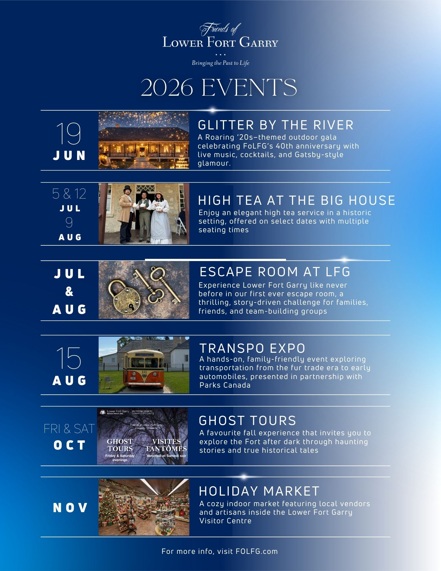 A year of signature events awaits at Lower Fort Garry, featuring Glitter by the River, High Tea at the Big House, our FIRST EVER Escape Room, Transpo Expo, Ghost Tours, and the Annual Holiday Market! There’s something for everyone this season!